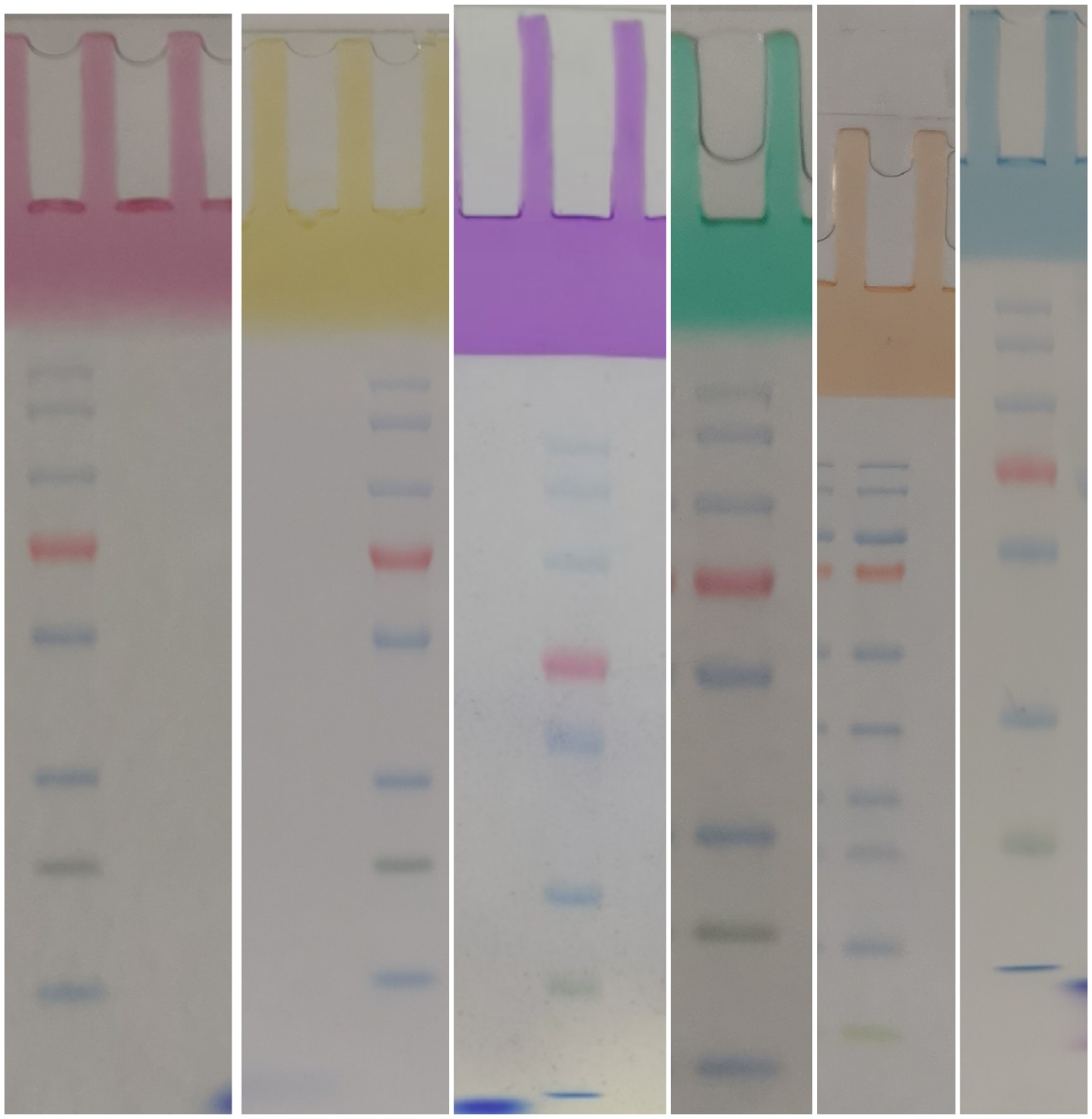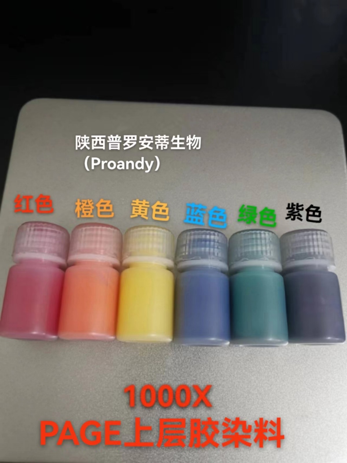 2. 由于经常会出现不同样本平行电泳多块凝胶的现象,因此本公司同时提供多种颜色的浓缩胶染料, 包括红色、橙色、黄色、蓝色、绿色、紫色........(其他色可以定制)以用于区分不同样本不同凝胶电泳。